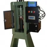 A mechanical testing machine equipped with the appropriate compression platens is used for the test. One of the platens must be spherically seated to allow slight tilt adjustment if the faces of the specimen are not perfectly parallel. The test machine operates in compression at slow test speeds in a load rate range indicated by the specification. Once the appropriate load rate is achieved a constant rate of movement is maintained through sample break. Accurate speed control is required in order to maintain the rate of motion once the sample begins to yield and ultimately break. Hydraulic compression testers are preferred for these tests due to their high force capacity. The results of the test may be recorded manually or electronically, depending on the system being used for the test.