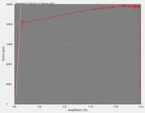 Some metals, particularly annealed low-carbon steel, or mild steel, show a discontinuity when transitioning from elastic to plastic deformation that produces the yield point phenomenon in the stress strain curve. Learn more about this phenomenon in our blog post. Read the article here.
