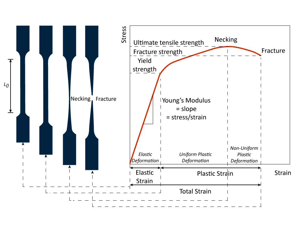When the tension test is started and Specimen A or Specimen B is pulled, the strain is uniform along the gauge length up to the point at which the maximum force is reached and the onset of necking occurs. The stretch in each material is uniform up to this point. The force will then start to drop, as shown in the stress-strain curve below, and the reduction of area will no longer be proportional to the amount of stretch in the material.
